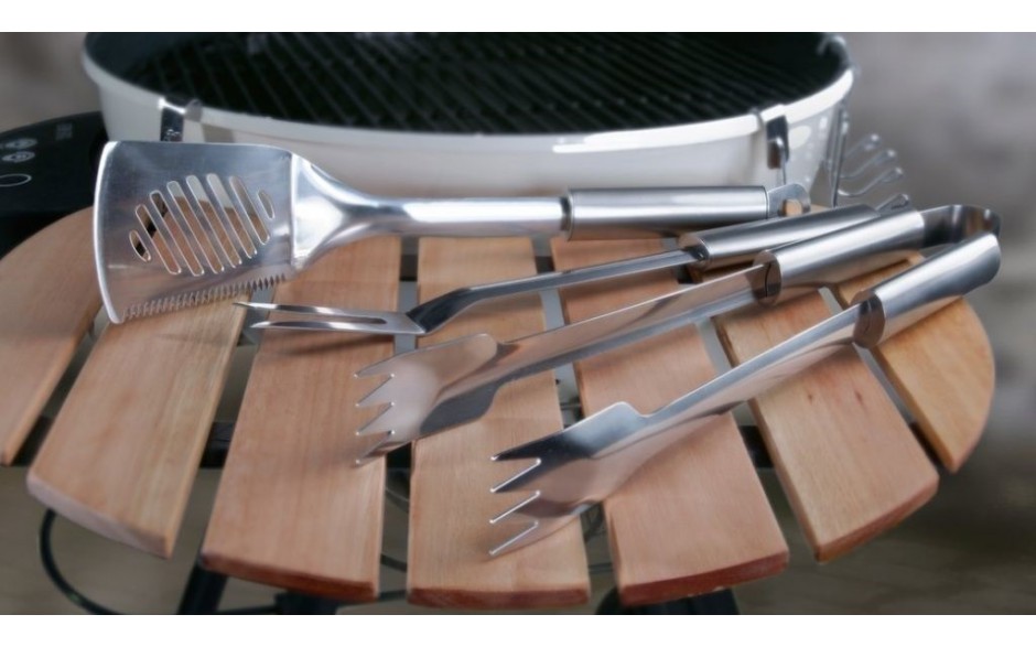 Alles im Griff mit dem 3-teiligen Set aus Zange, Wender und Gabel. Sieht nicht nur schön aus, sondern liegt auch gut in der Hand und ist leicht zu reinigen.